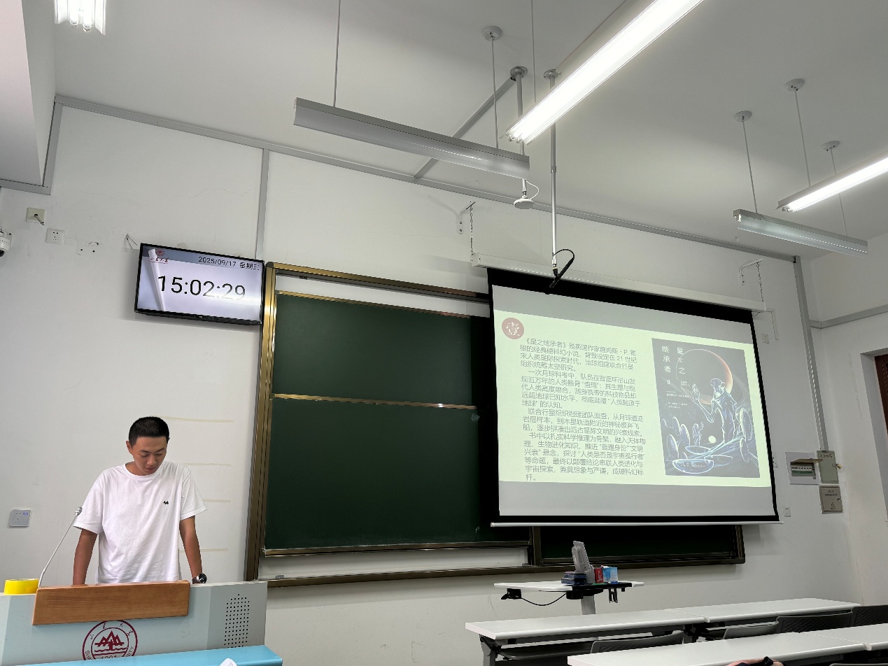 在分享交流环节中,多位同学走上讲台,结合自身阅读经历,分享了自己印象深刻的书籍和阅读时的感悟。有的从《人间词话》中感受中华文化魅力,在古典诗词中体会人间至情与境界之美;有的在《三体》、《星之继承者》里深入科幻世界,品读其瑰丽的想象与严谨的架构,激发了对科技与人文的交叉思考,拓宽认知边界。同学们踊跃发言,现场思想碰撞、气氛热烈。